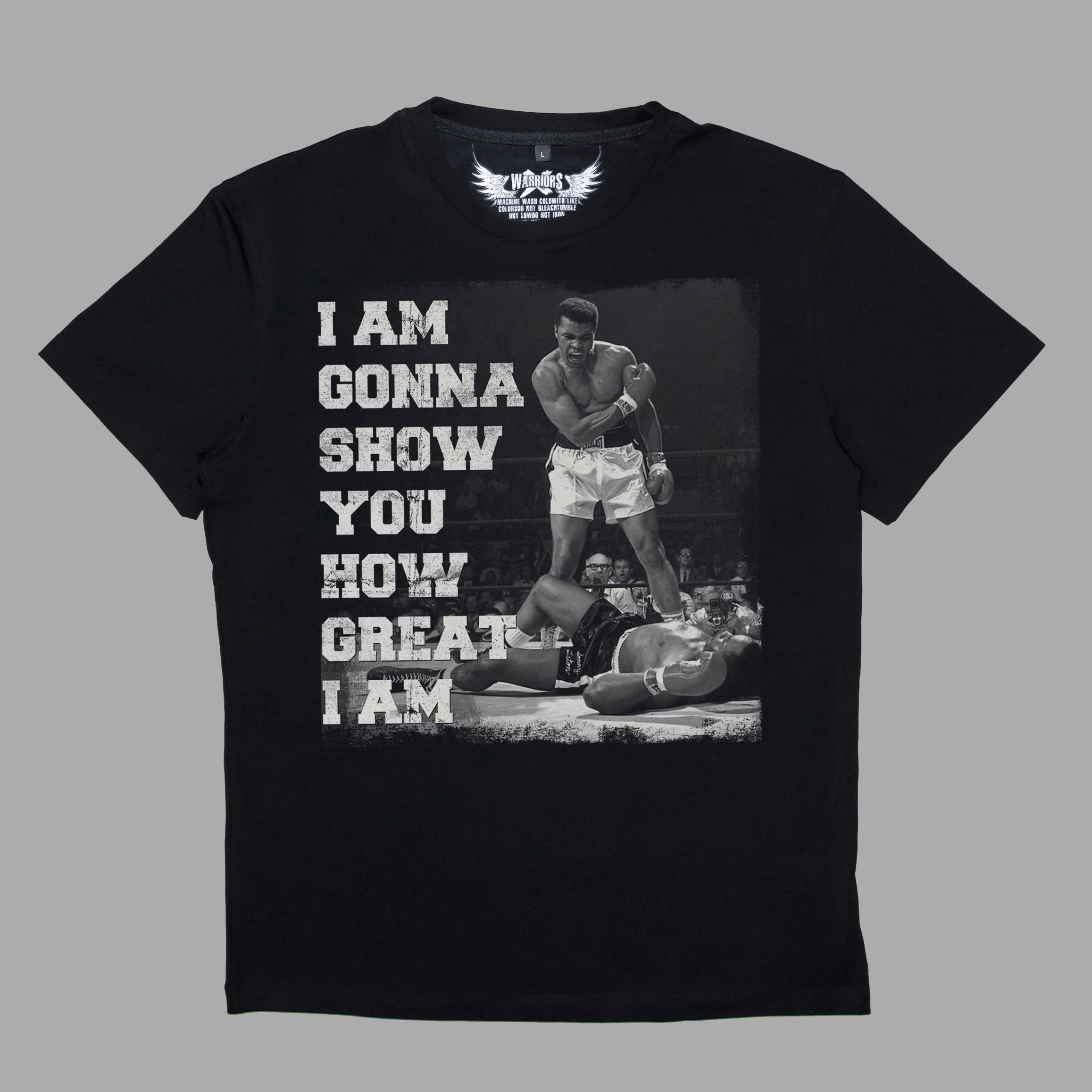 Футболка Muhammad Ali WarriorsX. Черная футболка из новой серии WarriorsX. Белый рисунок на черном фоне - это визитная карточка этой серии. Изображение одной из самых знаменитых фото Али. Надпись "Я покажу Вам насколько Я велик."