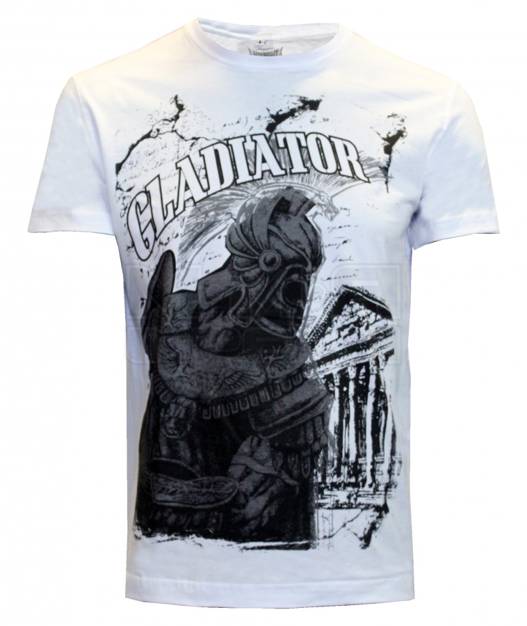 Светлая футболка из серии Warriors. На ней изображен гладиатор в амуниции на фоне сооружения той эпохи.