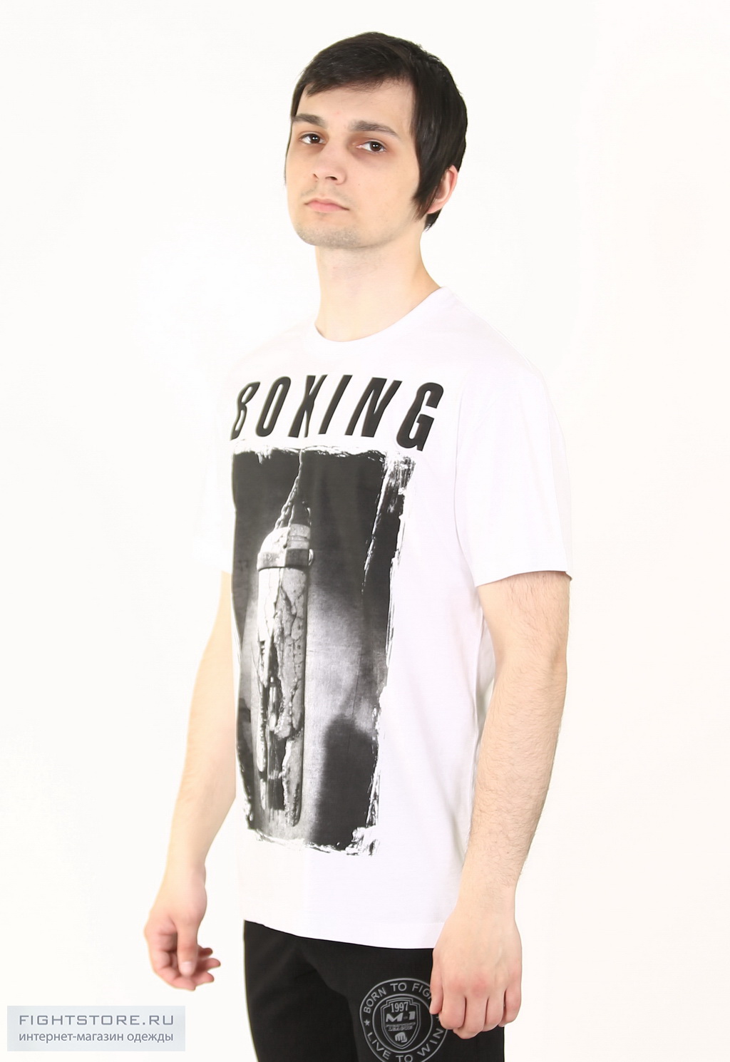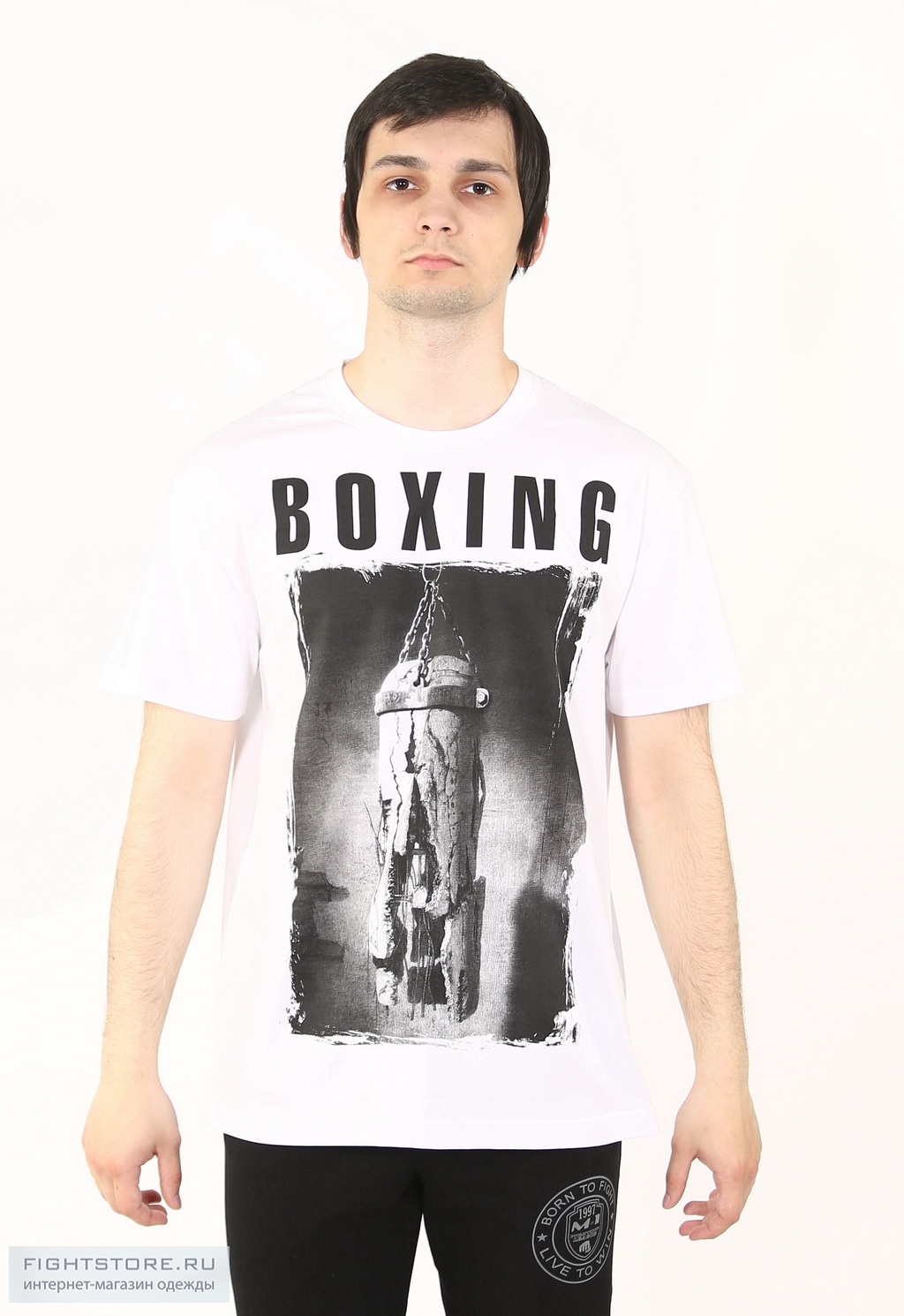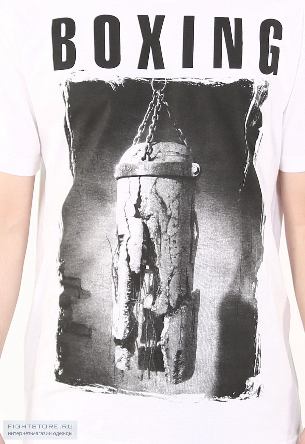 Белая футболка с изображением железобетонной боксерской груши, разбитой от ударов. Надпись Boxing (пер. Бокс). Отличная вещь для поклонников бокса, стильный дизайн и замечательный хлопковый материал.