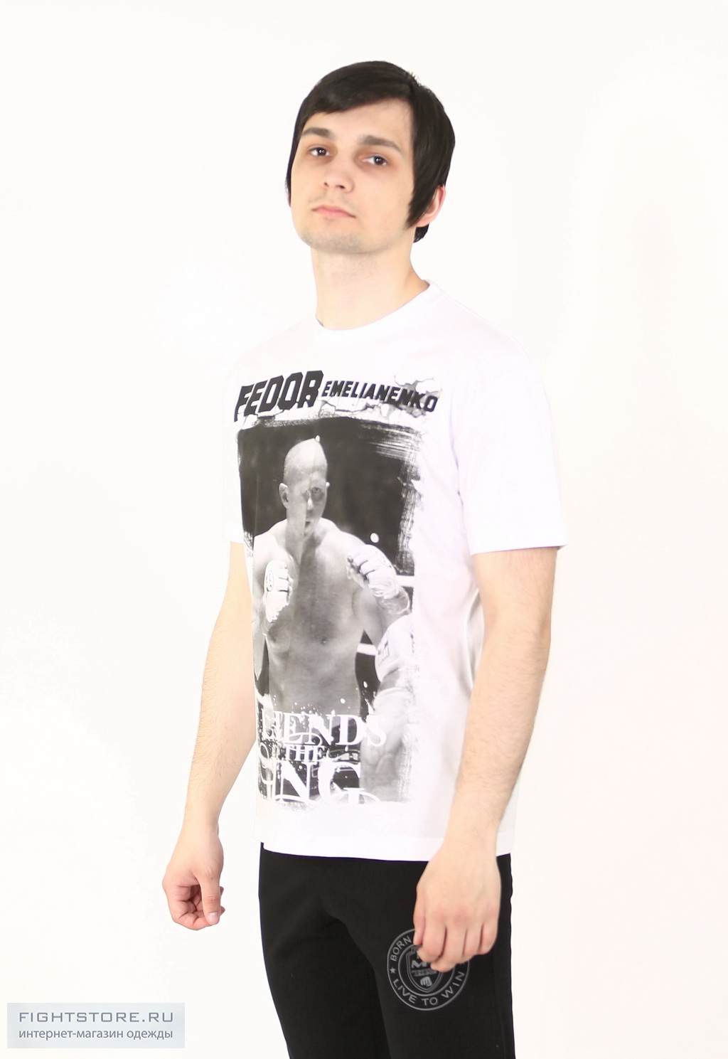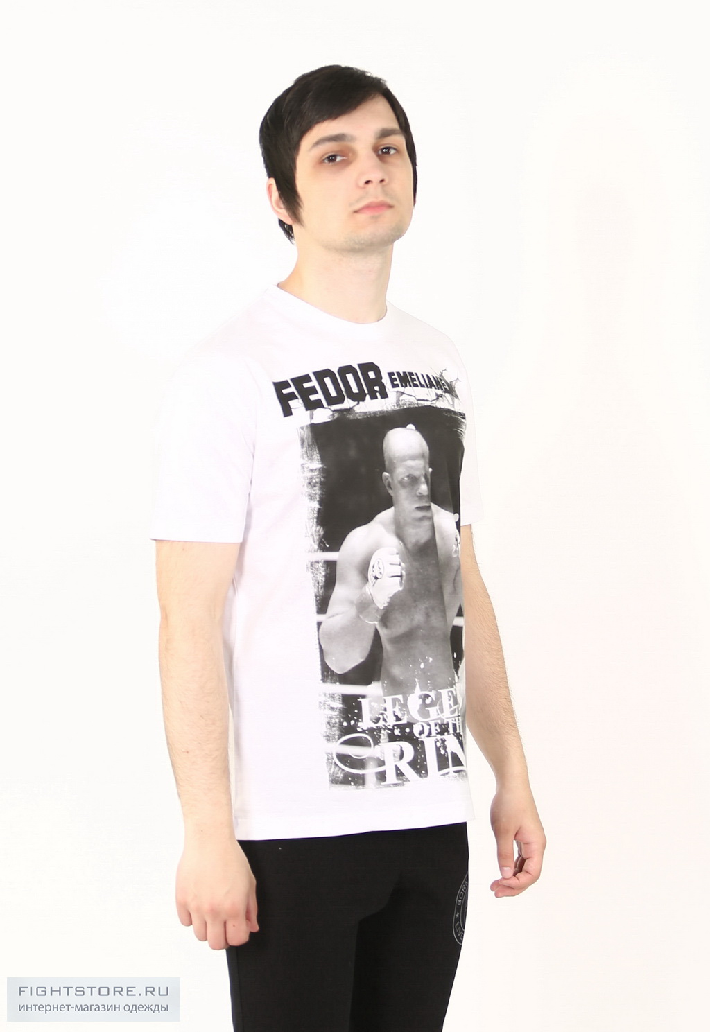 Футболка Федор Емельяненко - легенда ринга, белая. Модель создана из 100 % натурального хлопкового материала. Детали: модный крой, на лицевой стороне крупный принт с изображением известного спортсмена Федора Емельяненко.