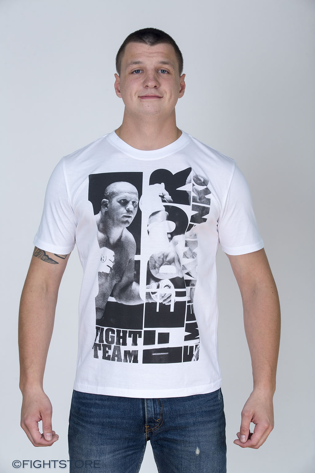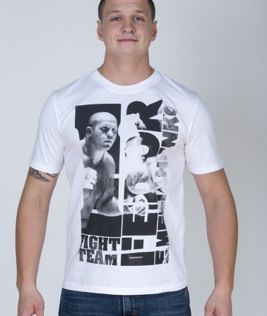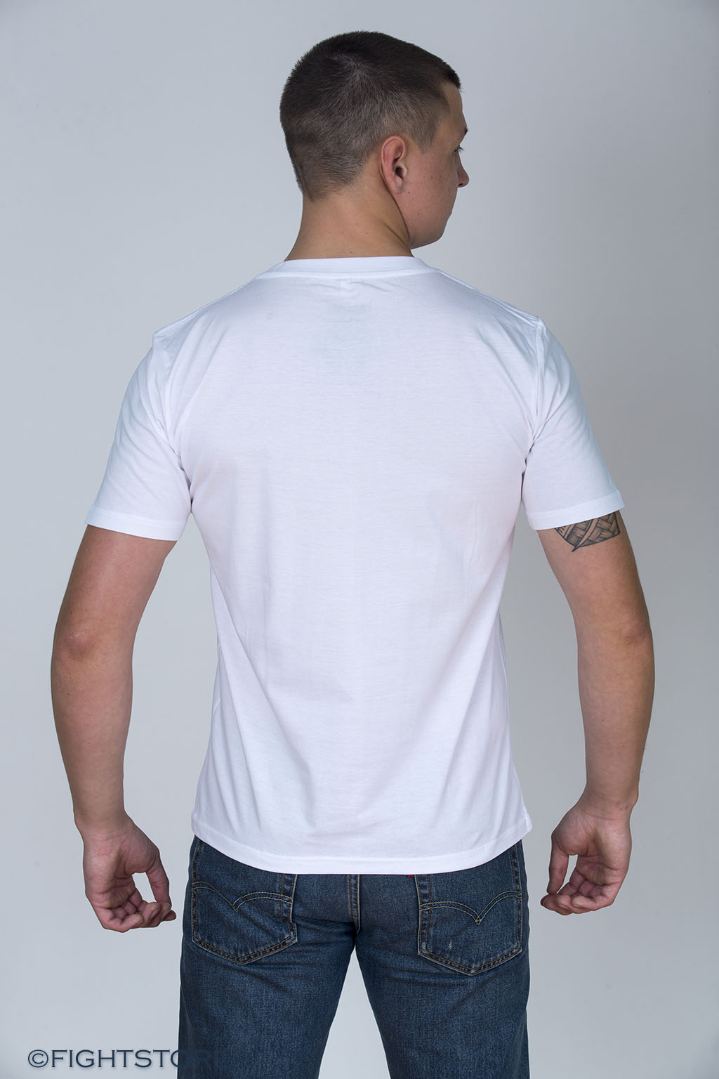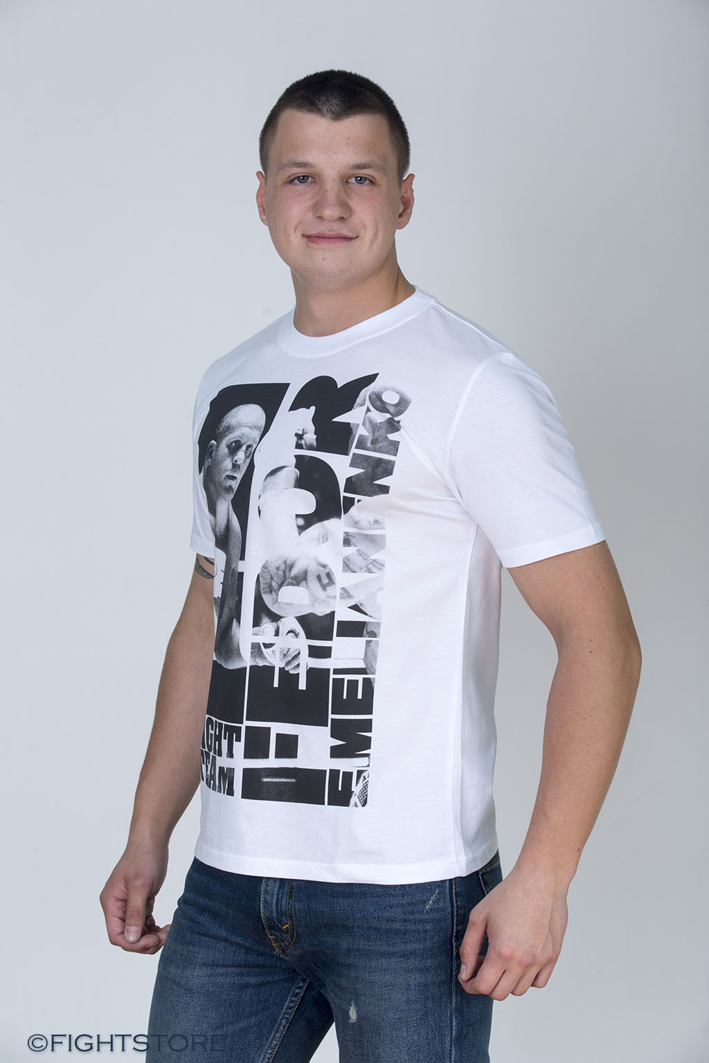 Белая футболка. Модель создана из 100 % натурального хлопкового материала. Детали: модный крой, на лицевой стороне крупный принт с изображением известного спортсмена Федора Емельяненко и надпись "FEDOR EMELIANENKO, FIGHT TEAM"