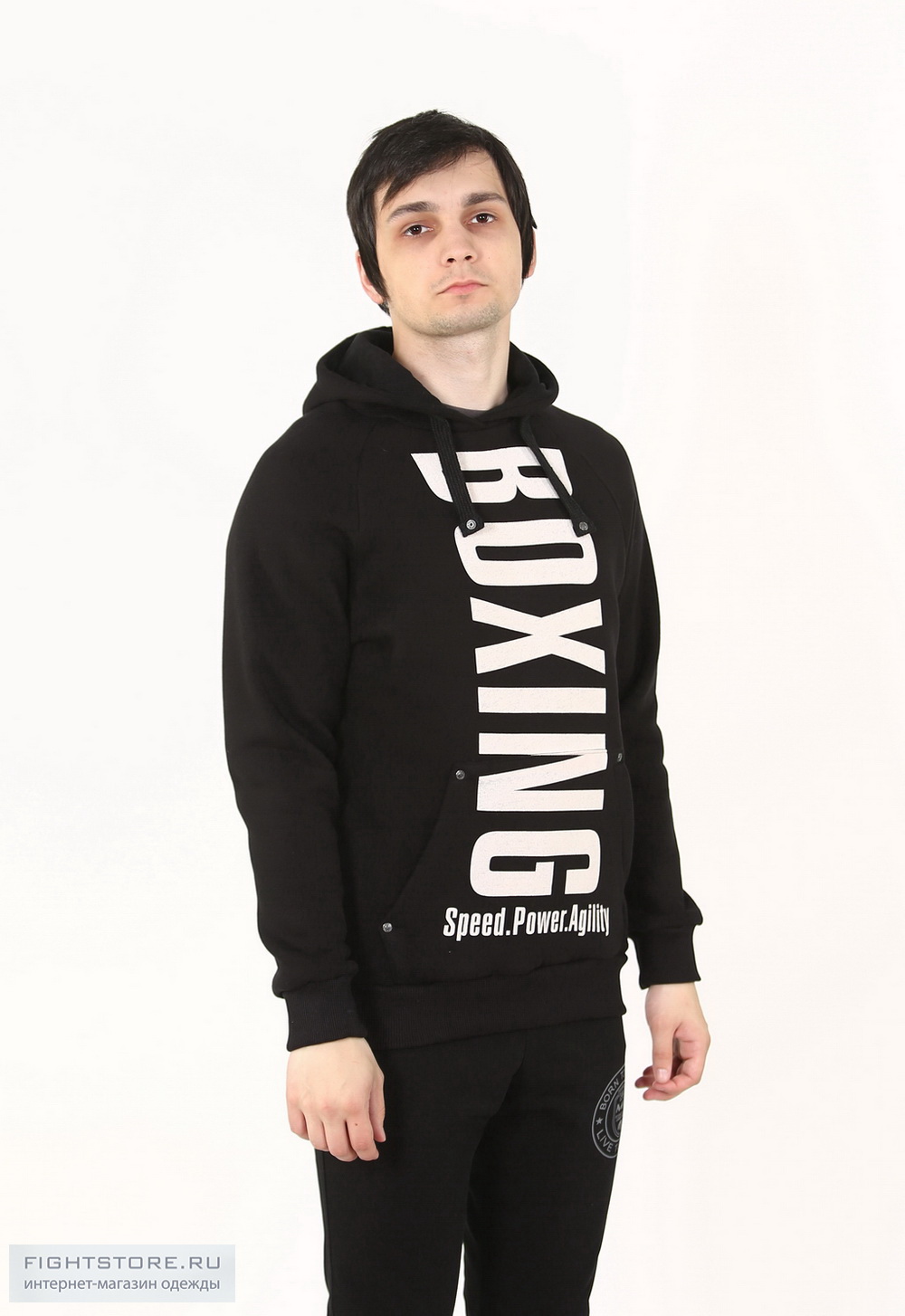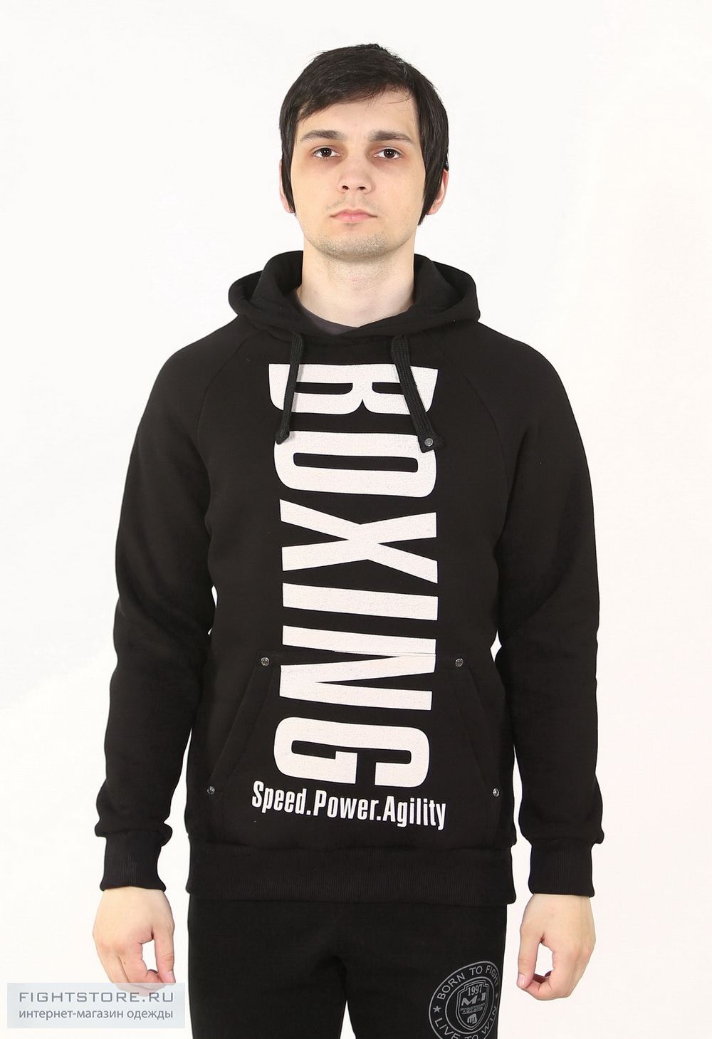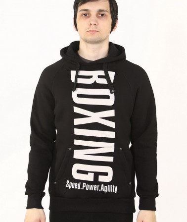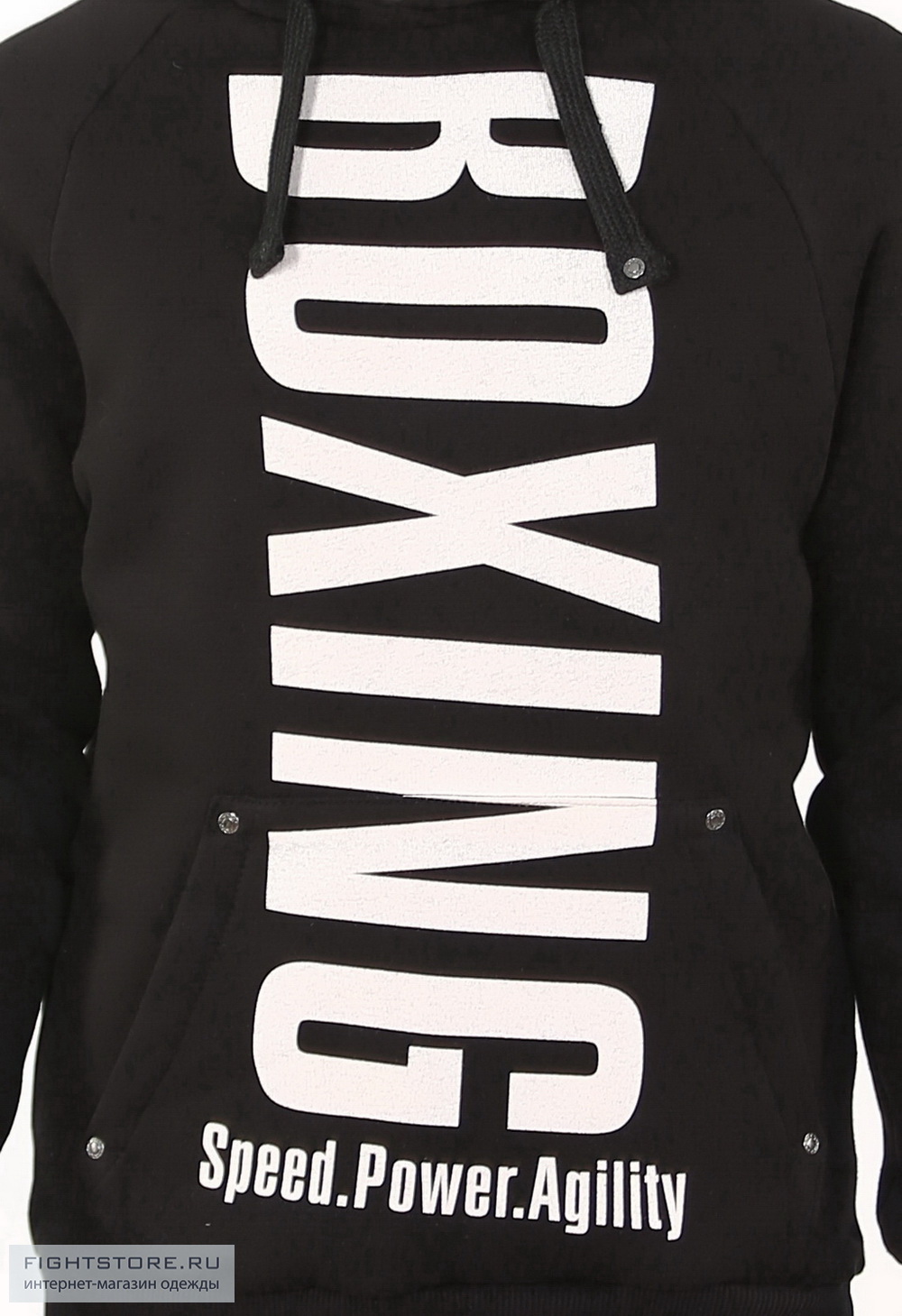 Толстовка для поклонников бокса. Спереди широкая надпись сверху вниз BOXING, ниже надпись Speed. Power. Agility (в пер. с англ. Скорость. Сила. Ловкость).
