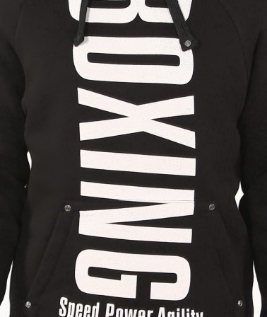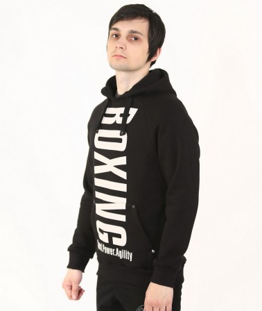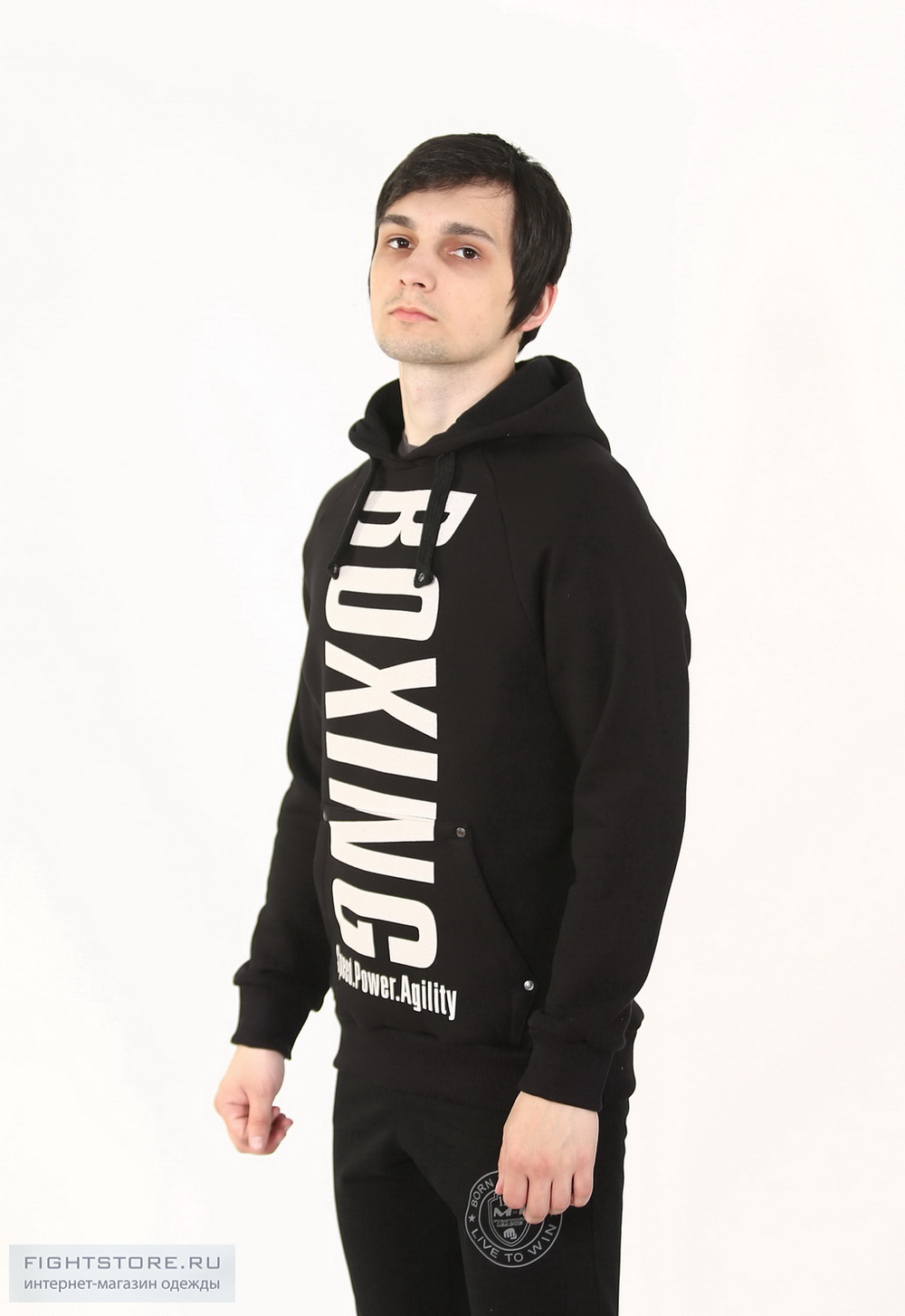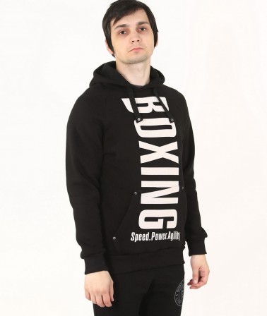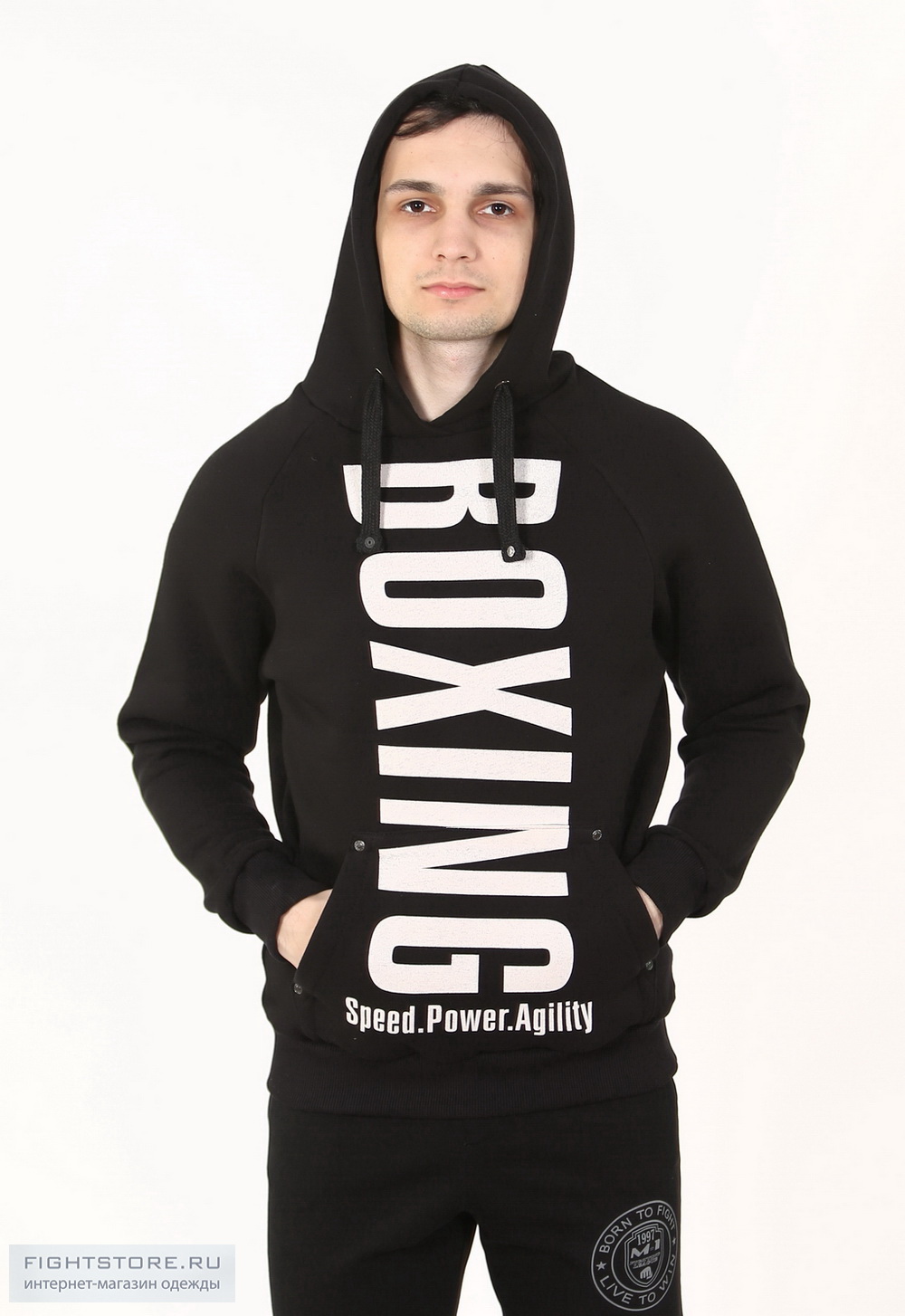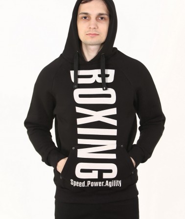 Толстовка для поклонников бокса. Спереди широкая надпись сверху вниз BOXING, ниже надпись Speed. Power. Agility (в пер. с англ. Скорость. Сила. Ловкость).