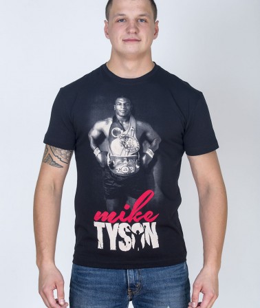 Футболка Майк Тайсон Чемпион с изображением Майка Тайсона, на котором одеты пояса чемпиона мира по боксу в тяжелом весе. Спереди большой принт с фото Майка Тайсона, внизу надпись Mike Tyson.