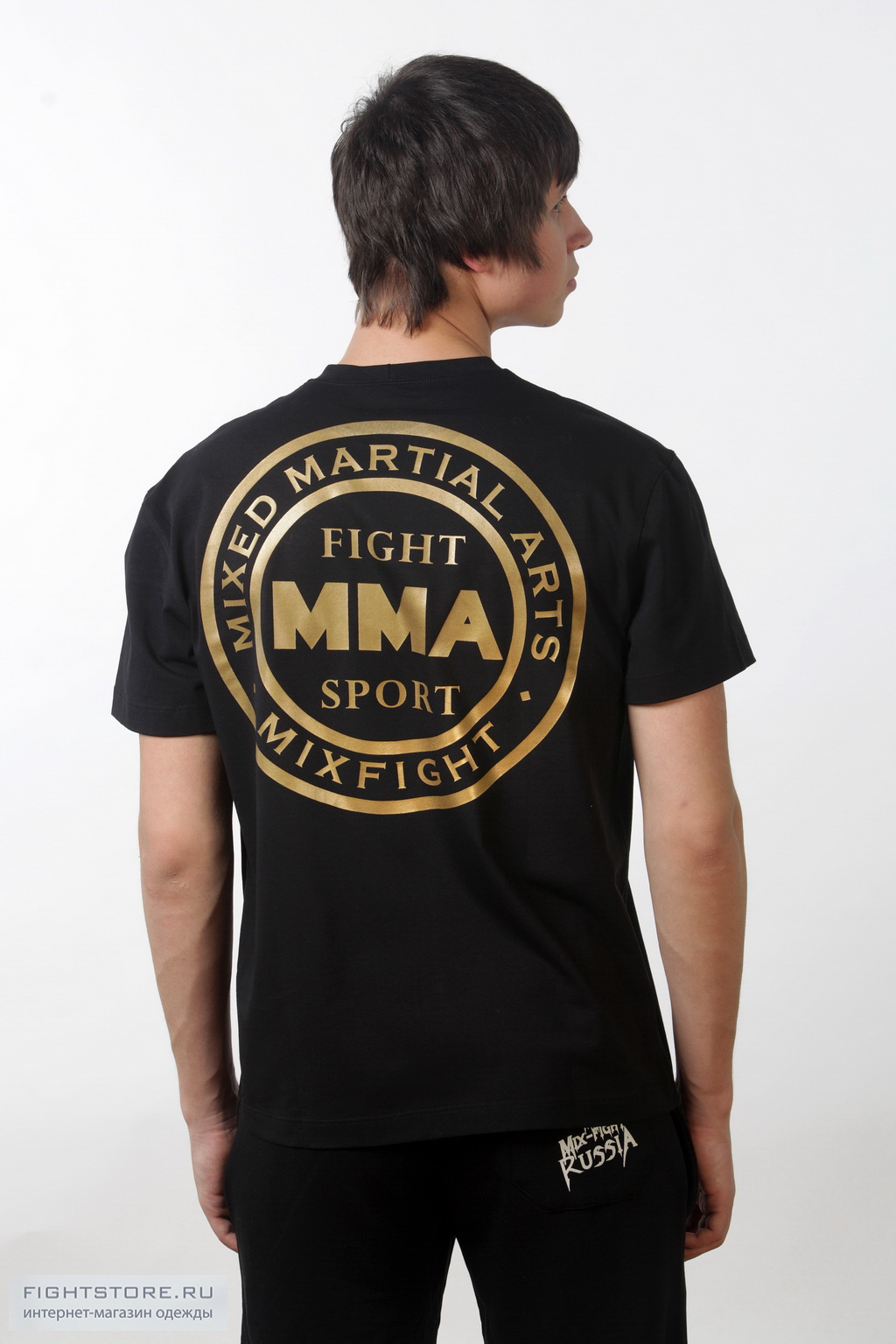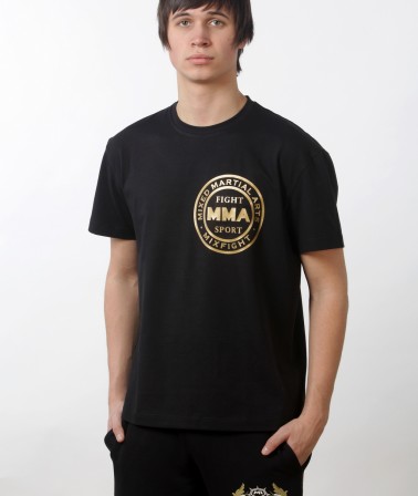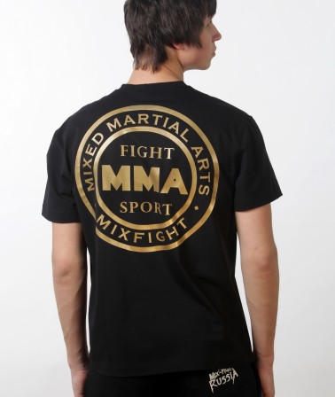 Футболка MMA черная с золотым логотипом выполнена из материала используемом модным домом Armani. Приятный на ощупь мягкий однородный материал, не теряющий форму при длительном использовании, хорошо сидит и выгодно подчеркивает фигуру человека.