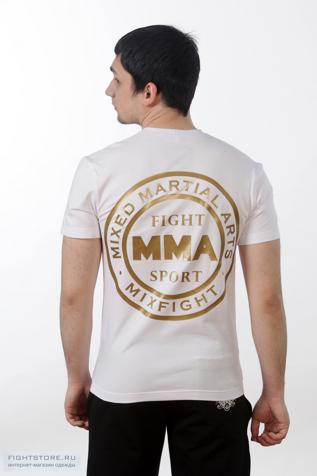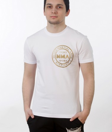 Футболка MMA белая с золотым логотипом выполнена из материала используемом модным домом Armani. Приятный на ощупь мягкий однородный материал, не теряющий форму при длительном использовании, хорошо сидит и выгодно подчеркивает фигуру человека.