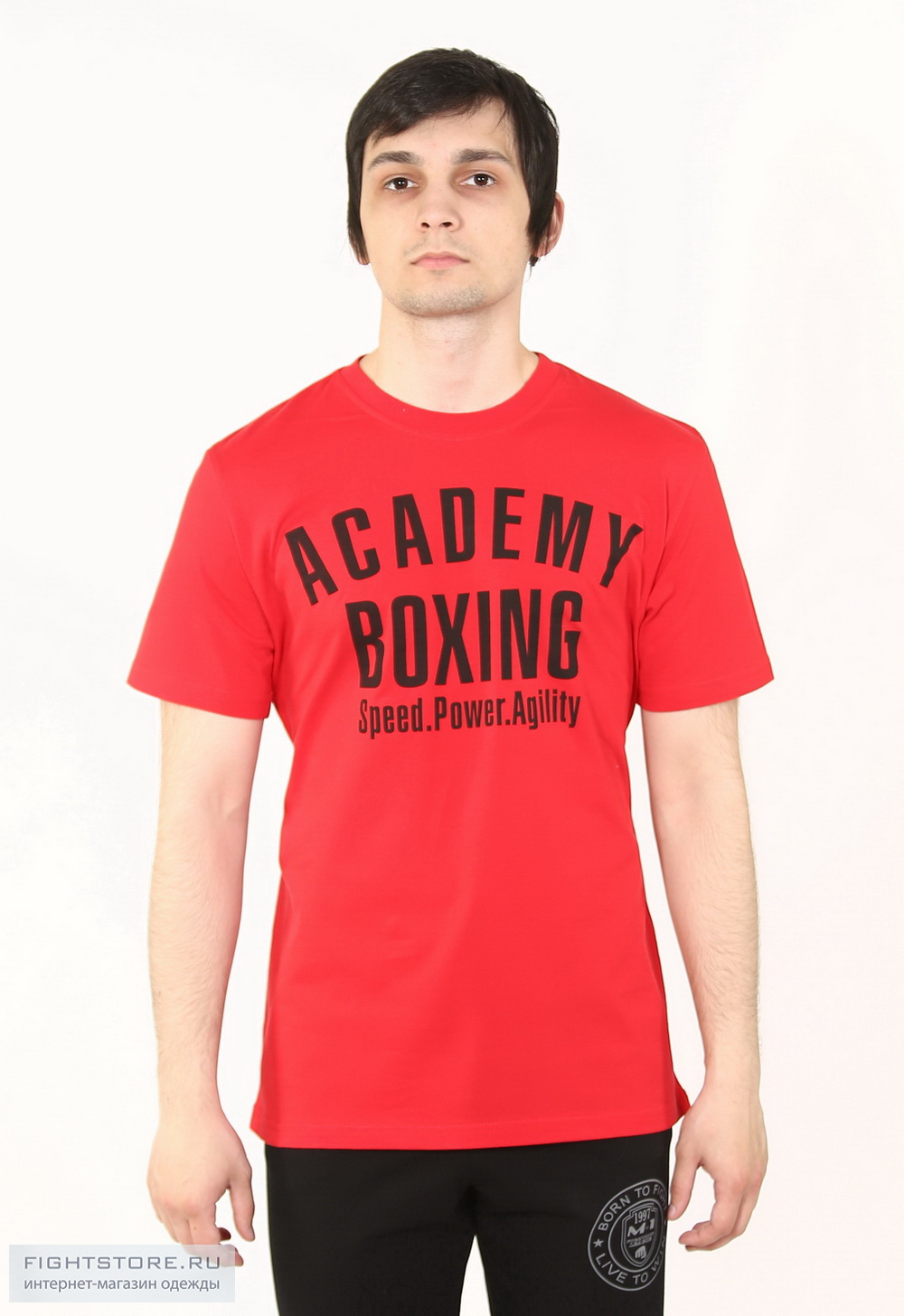 Футболка для поклонников бокса. Спереди надпись Academy BOXING (пер. с англ. Школа бокса), ниже надпись Speed. Power. Agility (в пер. с англ. Скорость. Сила. Ловкость).