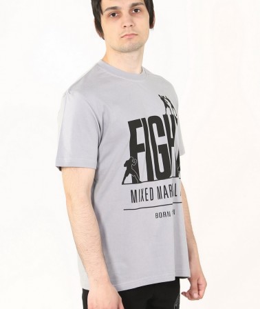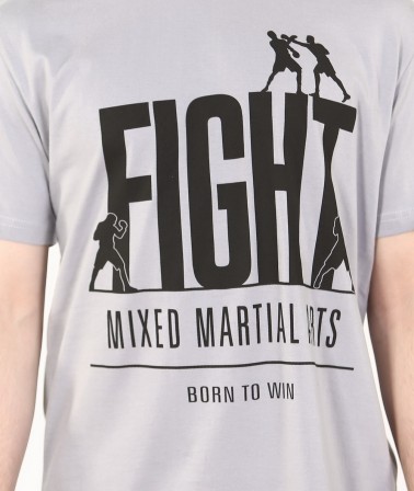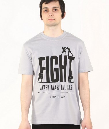 Футболка FIGHT мма серая со стильным изображением. Надписи Fight (пер. Бой, Борьба). Mixed Martial Arts - смешанные единоборства. И лого на котором изображены бойцы.