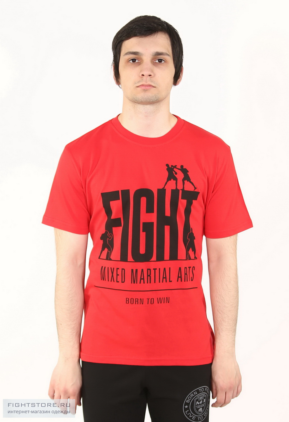 Футболка FIGHT мма со стильным изображением. Надписи Fight (пер. Бой, Борьба). Mixed Martial Arts - смешанные единоборства. Лого на котором изображены бойцы и надпись Born to win (пер. Рожденный победить)