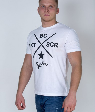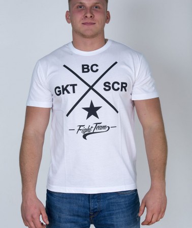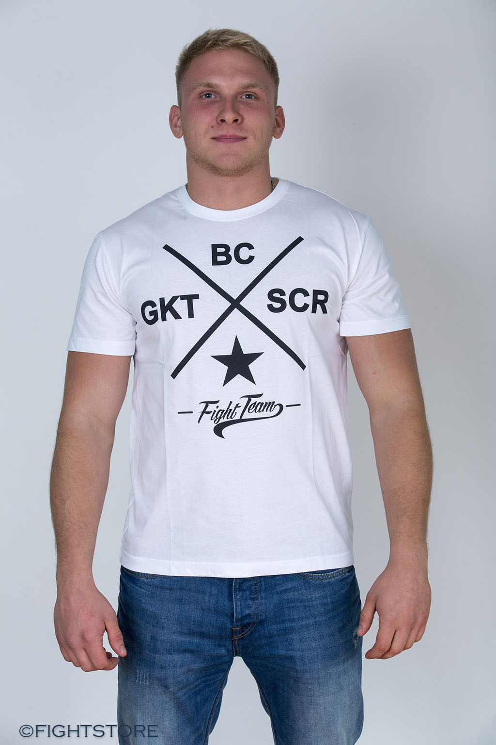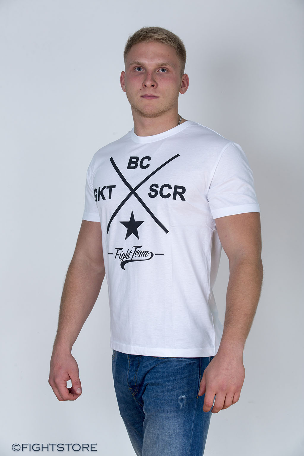 Белая футболка FIGHT TEAM SCR из стопроцентного хлопка, в ней воздух будет свободно проникать к телу, давая коже дышать. Спереди принт с надписями выполненными черной краской: FIGHT TEAM. Уникальная футболка для поклонников стильной одежды с символикой единоборств и ММА по самой выгодной цене в интернете.