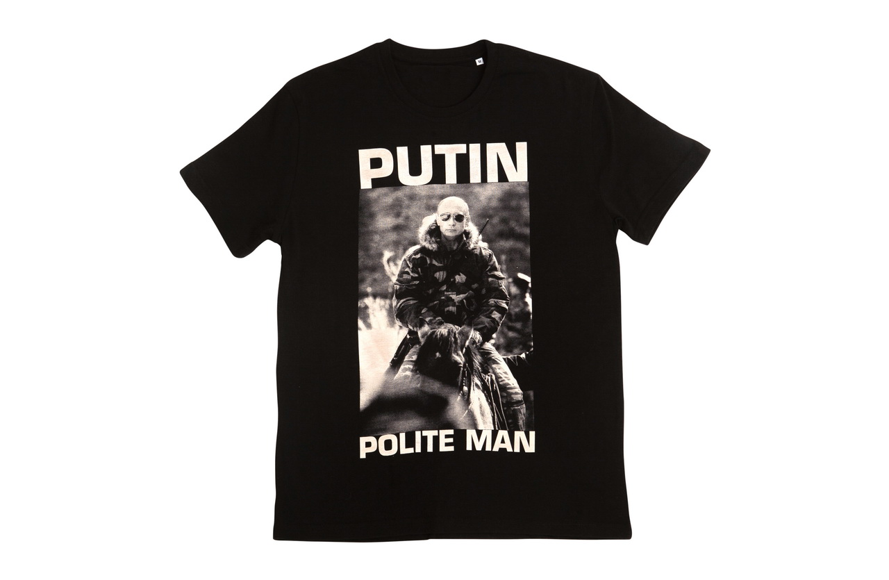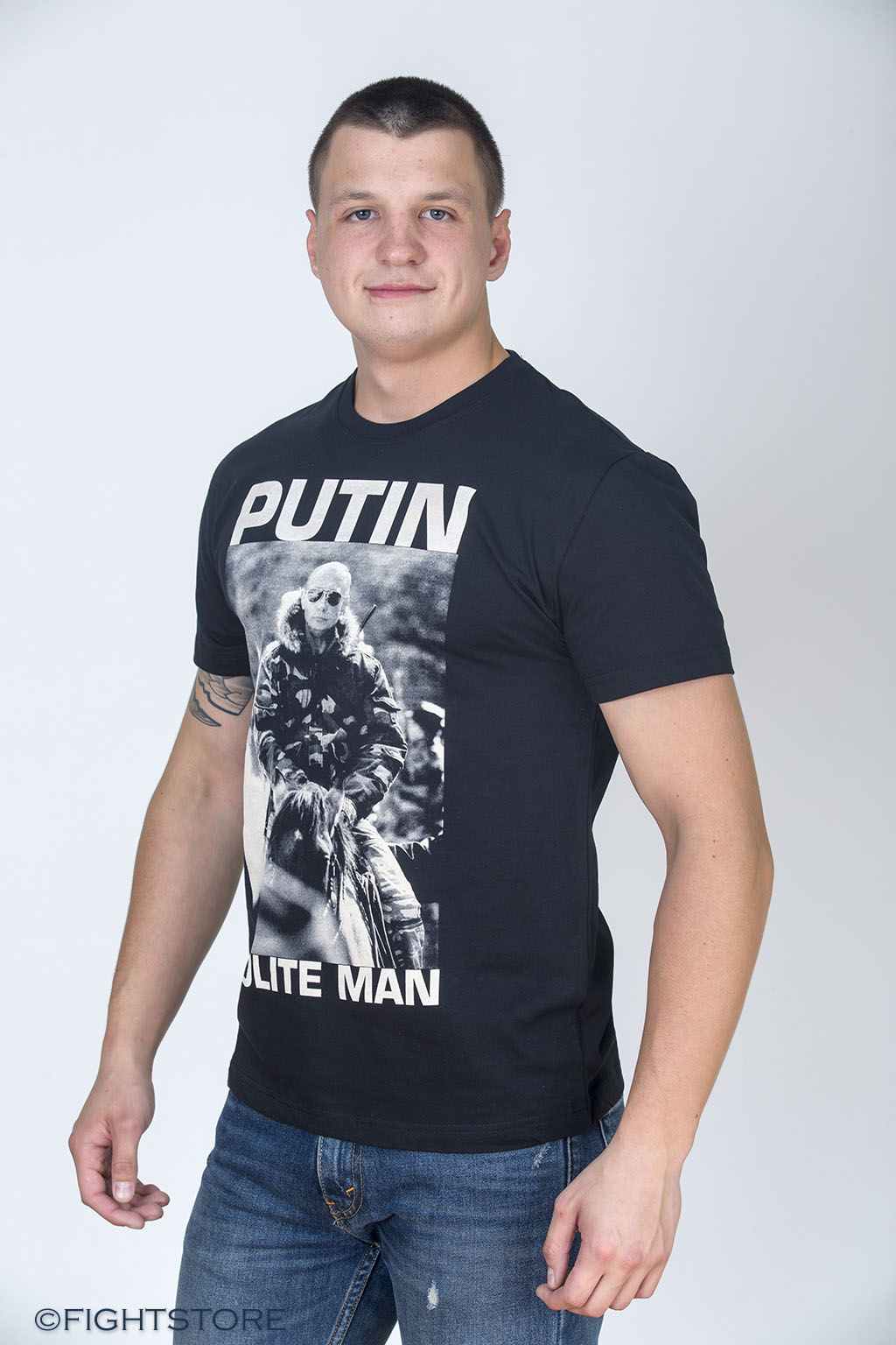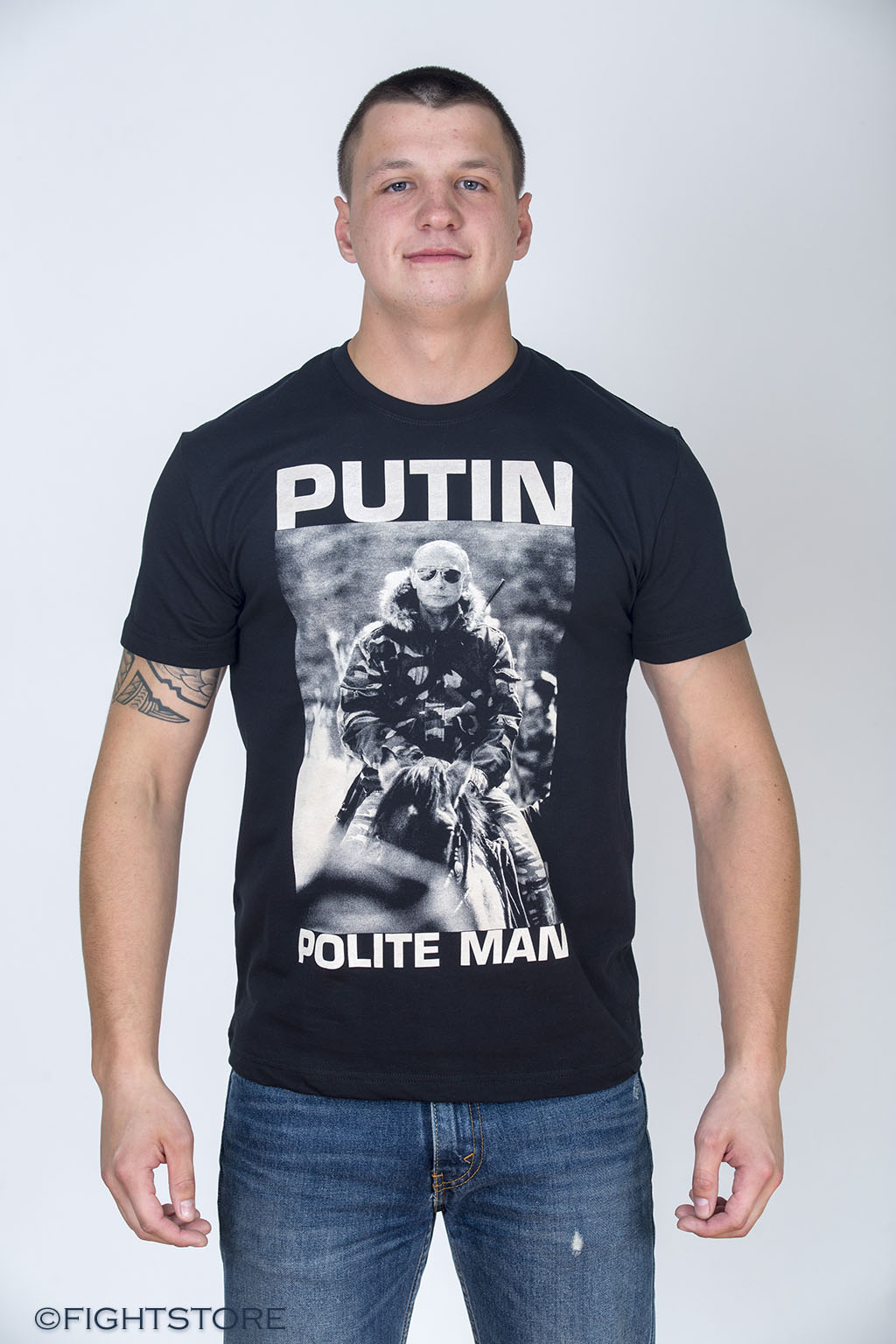 Футболка В. Путин Polite Man с крупным изображением фото, облетевшего все новостные издания России, Владимира Путина верхом на коне. Футболка удобно сидит и комфортно облегает фигуру.