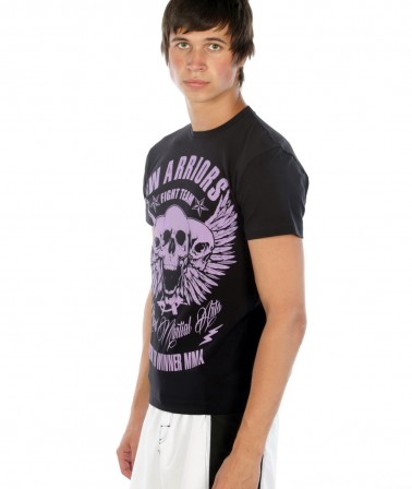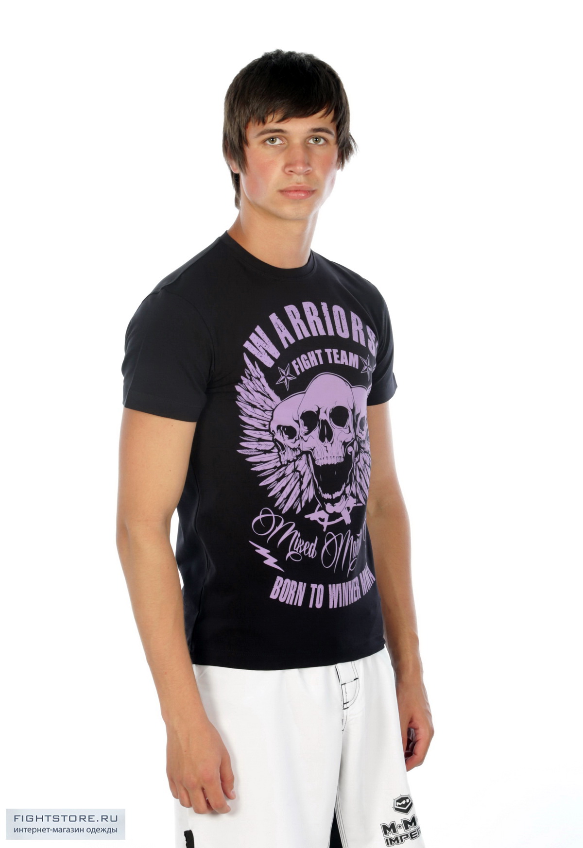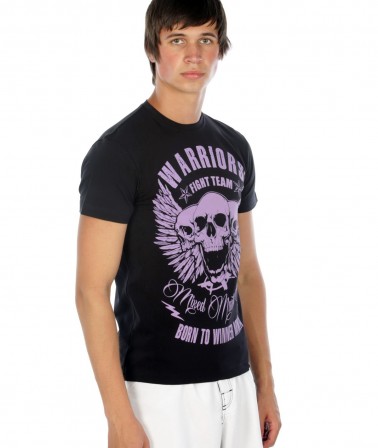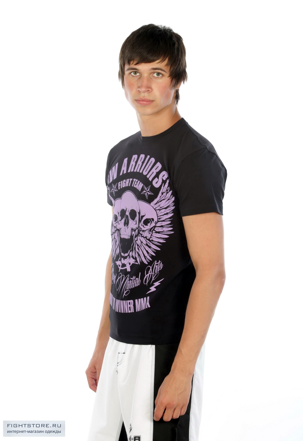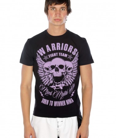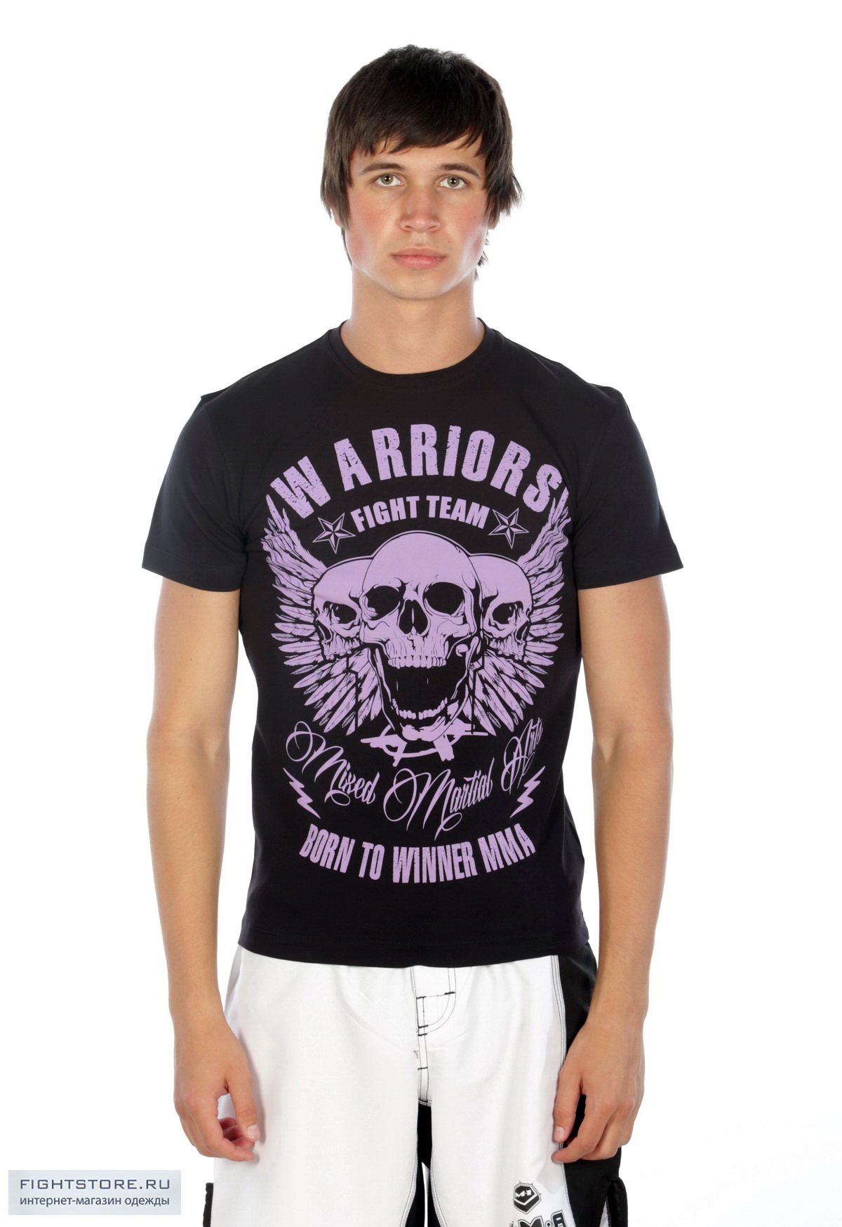 Черная футболка WARRIORS из прексаного стрейтч-материала, идеально сидит по фигуре. Спереди принт с надписями выполненными фиоетовой краской: WARRIORS, FIGHT TEAM, MIXED MARTIAL ARTS. Уникальная футболка для поклонников стильной одежды с символикой единоборств и ММА по самой выгодной цене в интернете.