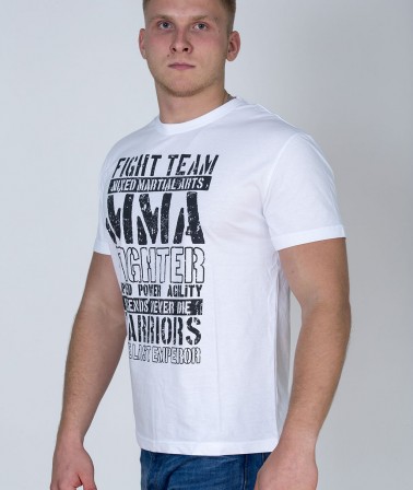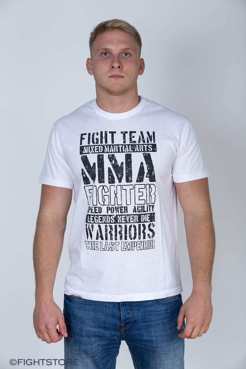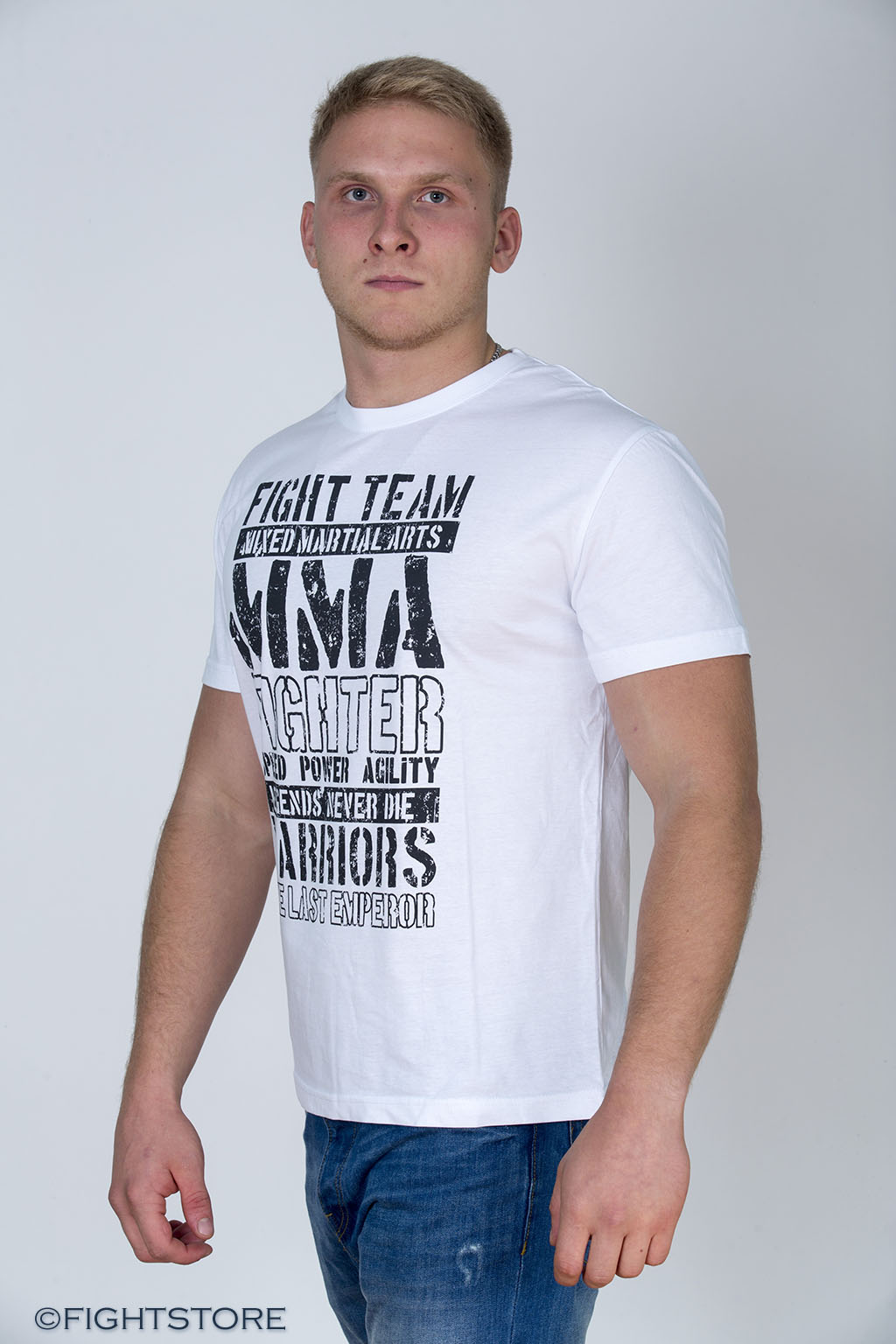 Белая футболка MMA FIGHTER из стопроцентного хлопка, в ней воздух будет свободно проникать к телу, давая коже дышать. Спереди принт с надписями выполненными зеленой краской: FIGHT TEAM, MMA FIGHTER, LEGENDS NEVER DIE, THE LAST EMPEROR, MIXED MARTIAL ARTS, POWER SPEED AGILITY. Уникальная футболка для поклонников стильной одежды с символикой единоборств и ММА по самой выгодной цене в интернете.